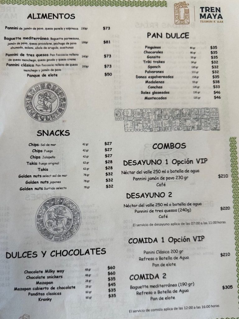 El menú del Tren Maya ofrece una variedad de snacks, bebidas y todo tipo de alimentos, principalmente, baguettes, paninis, postres y bebidas. Sin embargo, los usuarios criticaron que la mayoría de los productos son comerciales y no representan la gastronomía de la región.