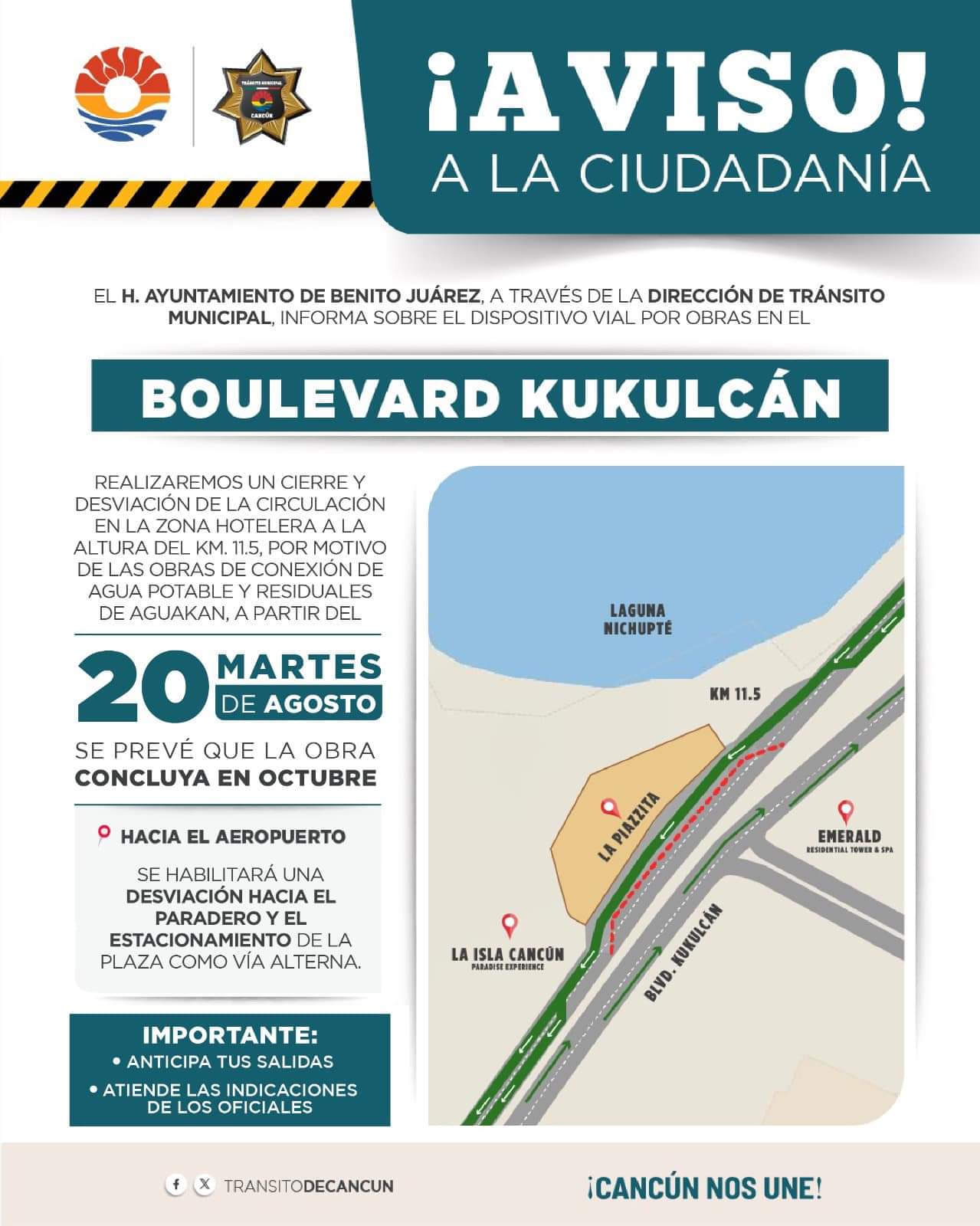 Cancún.- La Dirección de Tránsito municipal informó que, por obras en el bulevar Kukulcán que realiza la empresa concesionaria Aguakan, a partir de hoy se realizará el cierre y la desviación de la circulación en la Zona Hotelera a la altura del kilómetro 115.