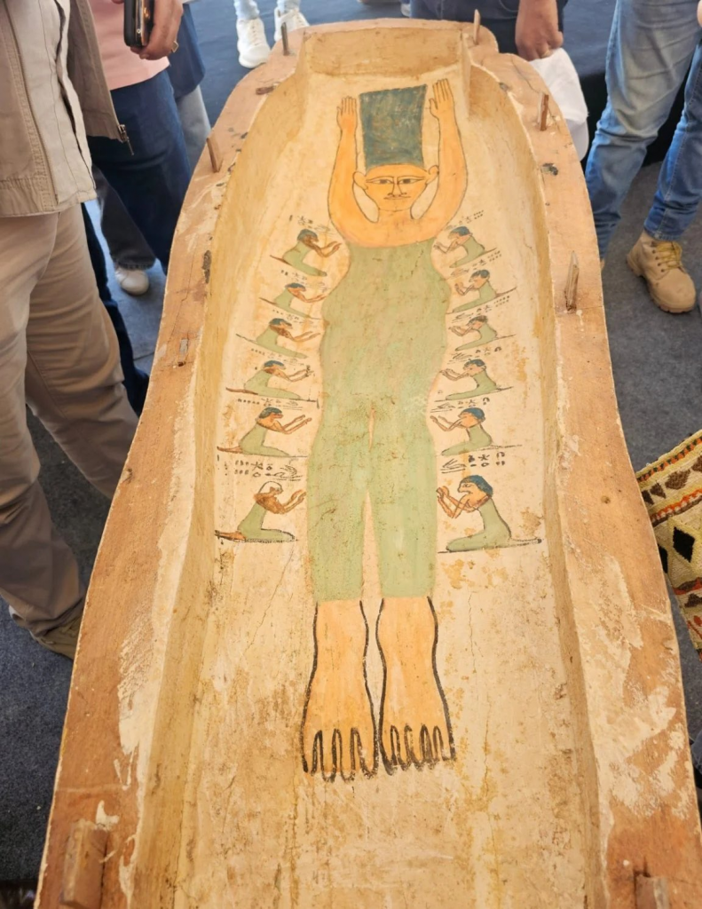 La semejanza ha causado revuelo en las redes sociales, donde los usuarios especulan sobre posibles conexiones entre las antiguas creencias egipcias y la cultura pop moderna. Sin embargo, el misterio se profundiza aún más: en la tapa del sarcófago también se encuentran figuras humanas que representan las doce horas, una escena que los expertos han descrito como «rara e importante», nunca antes vista en la iconografía funeraria egipcia.