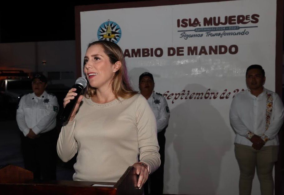 Isla Mujeres.- En los primeros minutos de este lunes, la Presidenta Municipal de Isla Mujeres, Atenea Gómez Ricalde, lideró el cambio de mando y pase de revista de las Fuerzas Municipales, donde hizo un llamado al personal a continuar trabajando con compromiso y responsabilidad para seguir avanzando en la construcción de paz en el municipio.