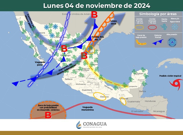 Por su parte, un canal de baja presión sobre el oriente y sureste del país, aunado al ingreso de humedad del océano Pacífico, golfo de México y mar Caribe, generarán lluvias puntuales muy fuertes en Oaxaca y Chiapas, y fuertes en Guerrero; esperándose lluvias y chubascos en el occidente, centro y oriente del país, incluido el valle de México y la península de Yucatán.