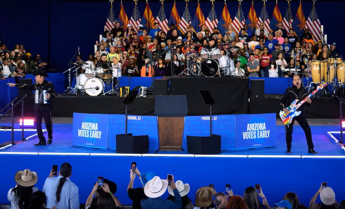ESTADOS UNIDOS.- En un evento que combinó música, política y cultura, el icónico grupo de música norteña, Los Tigres del Norte, acompañó a la vicepresidenta de EE.UU. y candidata demócrata, Kamala Harris, en su visita a Arizona este jueves. La campaña se centró en energizar a la comunidad latina y destacar la importancia de su voto en el estado, que podría inclinar la balanza en las próximas elecciones del 5 de noviembre.