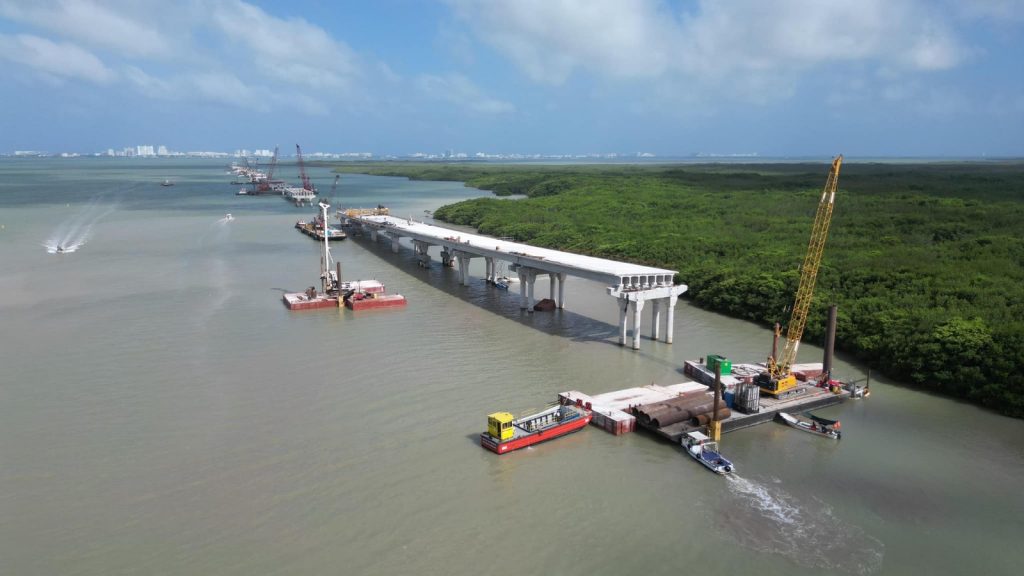 Lara De Nigris destacó que los trabajos continúan de forma acelerada, con esfuerzos en la zona lagunar mediante el uso de barcazas y en la liberación del distribuidor vial Kabah-Colosio-Bonampak-Tulum. Además, se está construyendo una estructura especial para salvar una caverna encontrada en el eje del puente, lo que garantizará la seguridad y eficiencia de la obra.