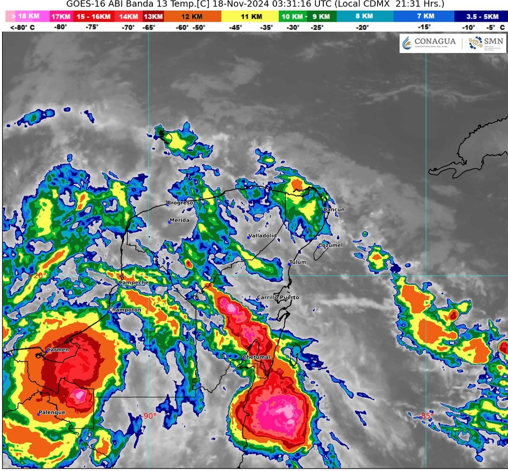Para la Península de Yucatán habrá cielo medio nublado a nublado durante el día, con lluvias puntuales fuertes en Campeche, Yucatán y Quintana Roo; las lluvias podrían acompañarse con descargas eléctricas y fuertes rachas de viento, reducir la visibilidad, originar encharcamientos e inundaciones.