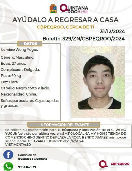 Cancún.- Weng Yugui, un joven de 27 años originario de China, fue reportado como desaparecido en Cancún. Su rastro se perdió el pasado 29 de diciembre en Plaza La Roca, ubicada en la supermanzana 310, según informó la Comisión de Búsqueda de Personas del Estado de Quintana Roo (CBPEQROO).