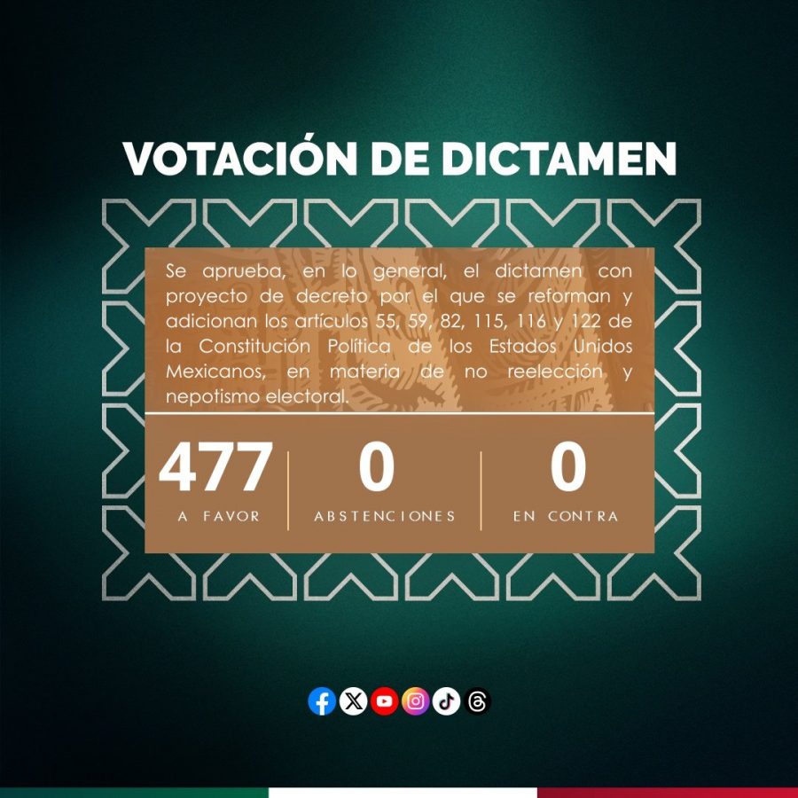 México.- La Cámara de Diputados aprobó en lo general una reforma constitucional que busca combatir el nepotismo y establecer la no reelección en cargos de elección popular hasta el año 2030. El dictamen reforma y adiciona los artículos 55, 59, 82, 115, 116 y 122 de la Constitución Política, enfocándose en la no reelección y el nepotismo electoral.