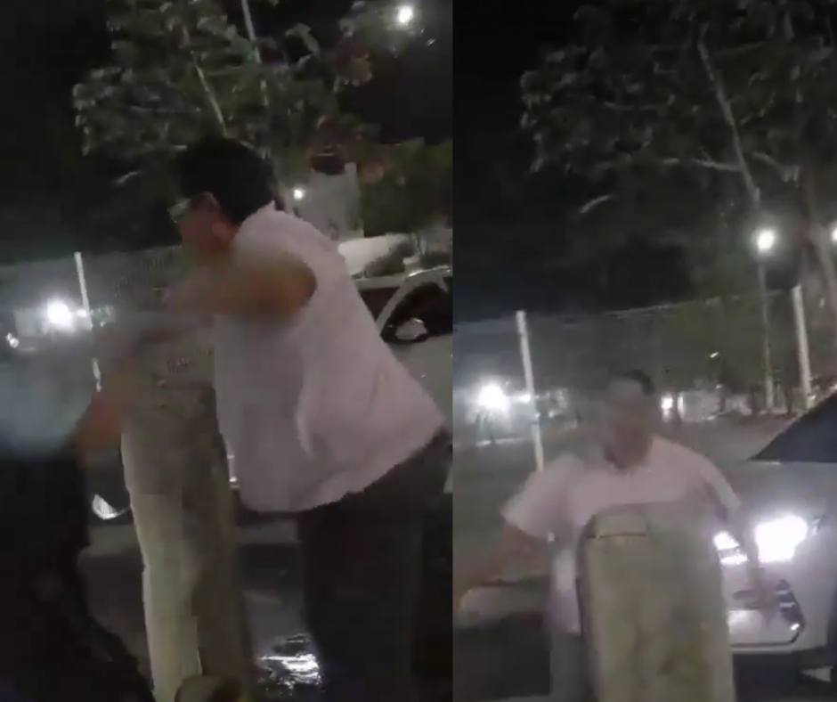 En las imágenes se observa al sujeto descender agresivamente de su camioneta blanca y dirigirse hacia la guardia de seguridad. En el proceso, le arrebata una cadena, supuestamente utilizada para resguardar espacios en el estacionamiento, y la emplea para golpear a la trabajadora.