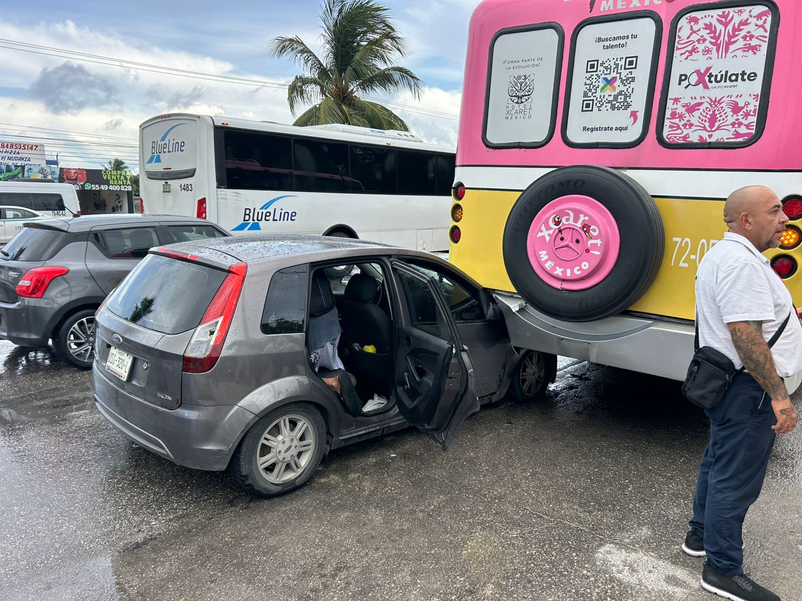 La maniobra fallida, sumada a la velocidad con la que circulaba, provocó que el conductor perdiera el control y se estrellara contra un autobús detenido que esperaba a que bajara personal del parque Xcaret.