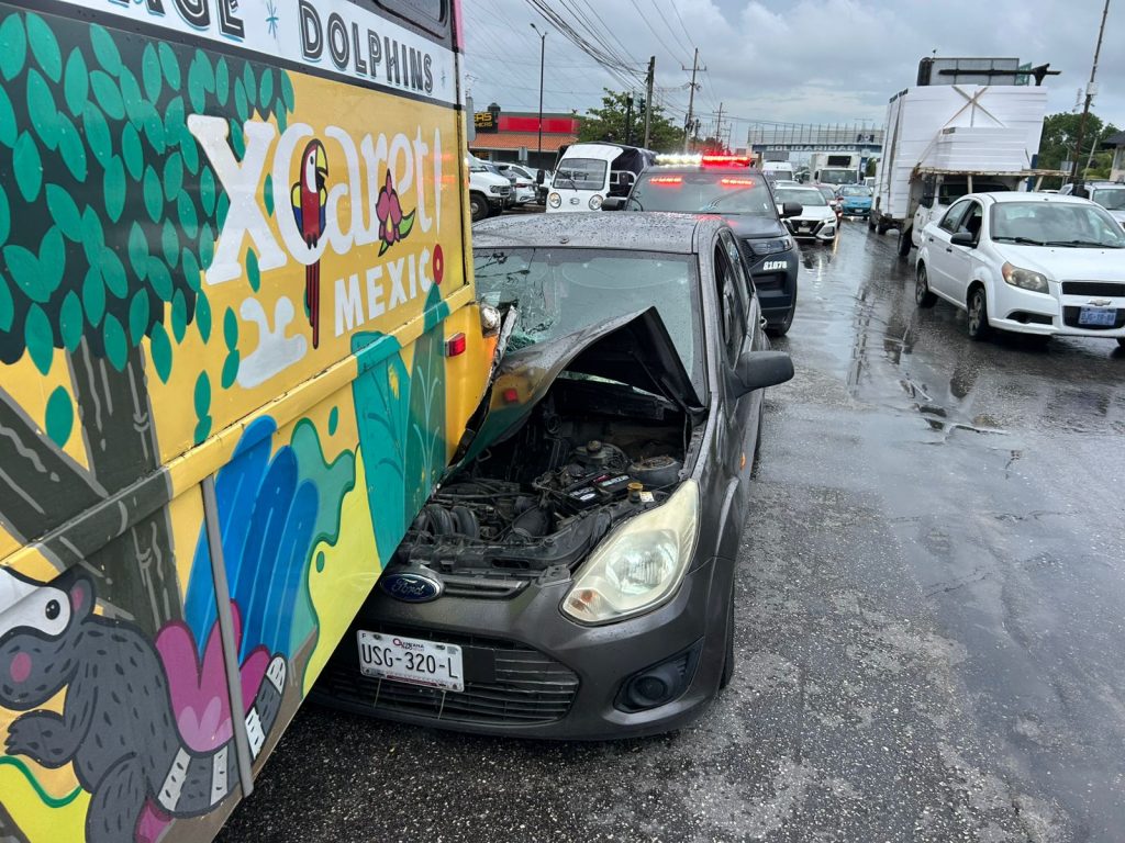 PLAYA DEL CARMEN.— La imprudencia al volante, combinada con la lluvia y el exceso de velocidad, provocó un aparatoso accidente la tarde de este martes sobre el bulevar Playa del Carmen, donde un automóvil terminó incrustado en la parte trasera de un autobús de transporte turístico. Por fortuna, no hubo personas lesionadas.