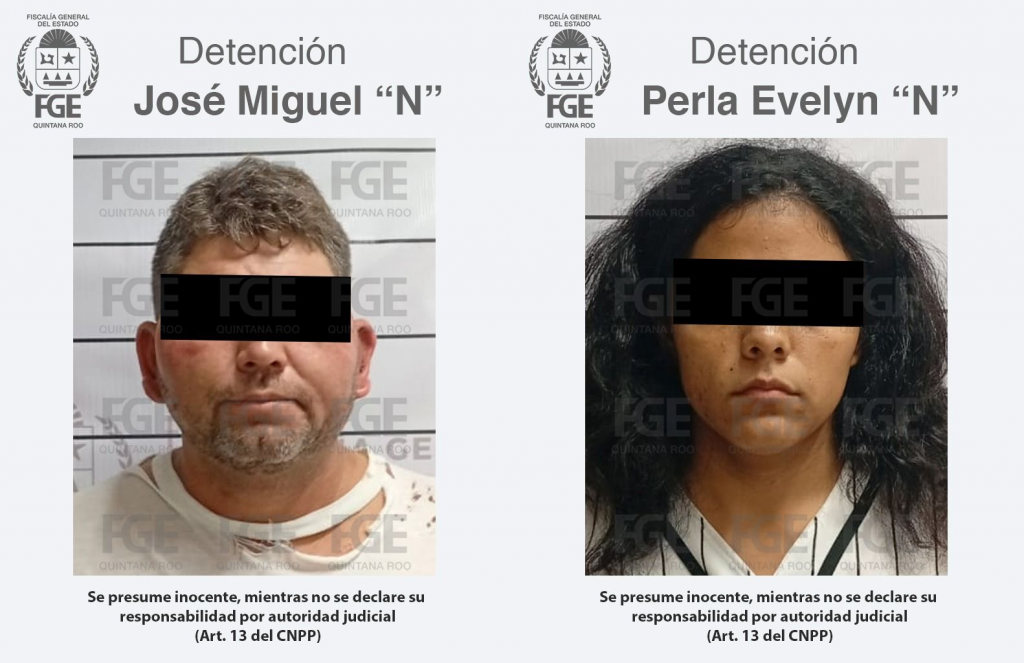PLAYA DEL CARMEN.— Por su presunta relación en hechos posiblemente constitutivos de los delitos de violencia familiar y violación en agravio de una víctima menor de edad, de identidad reservada, la FIscalía General del Estado detuvo, en este municipio, a una mujer y a un hombre, identificados como Perla Evelyn “N” y José Miguel “N”.