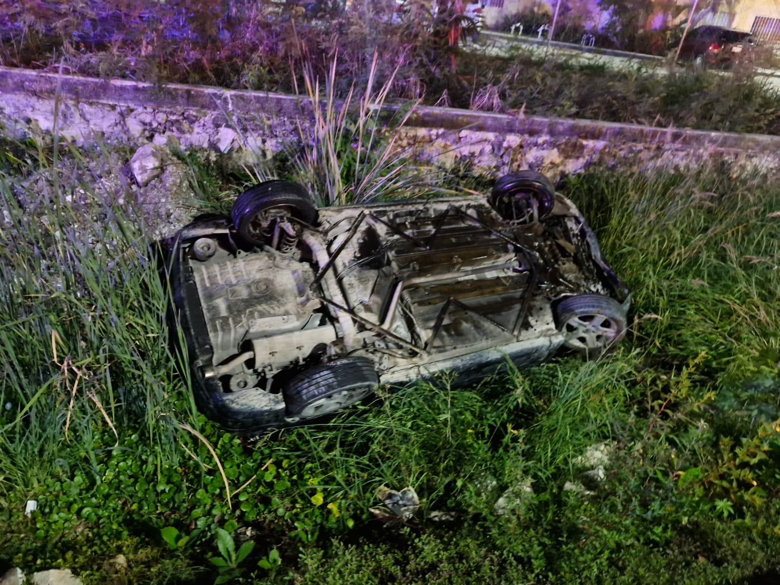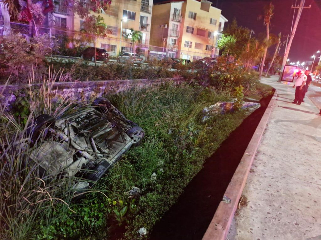 CANCÚN. — Una mujer resultó lesionada tras un accidente de tránsito en la colonia Donceles 28, luego de que el conductor del auto donde iba como copiloto, perdió el control por presunto exceso de velocidad. La unidad terminó volcada en un área de mangle.