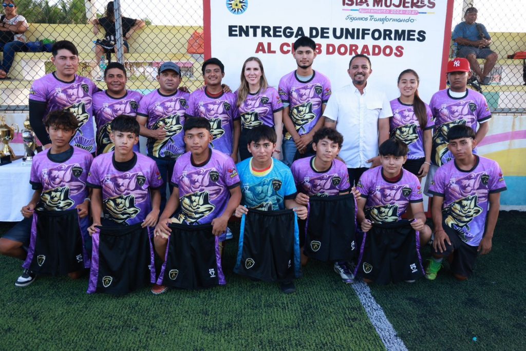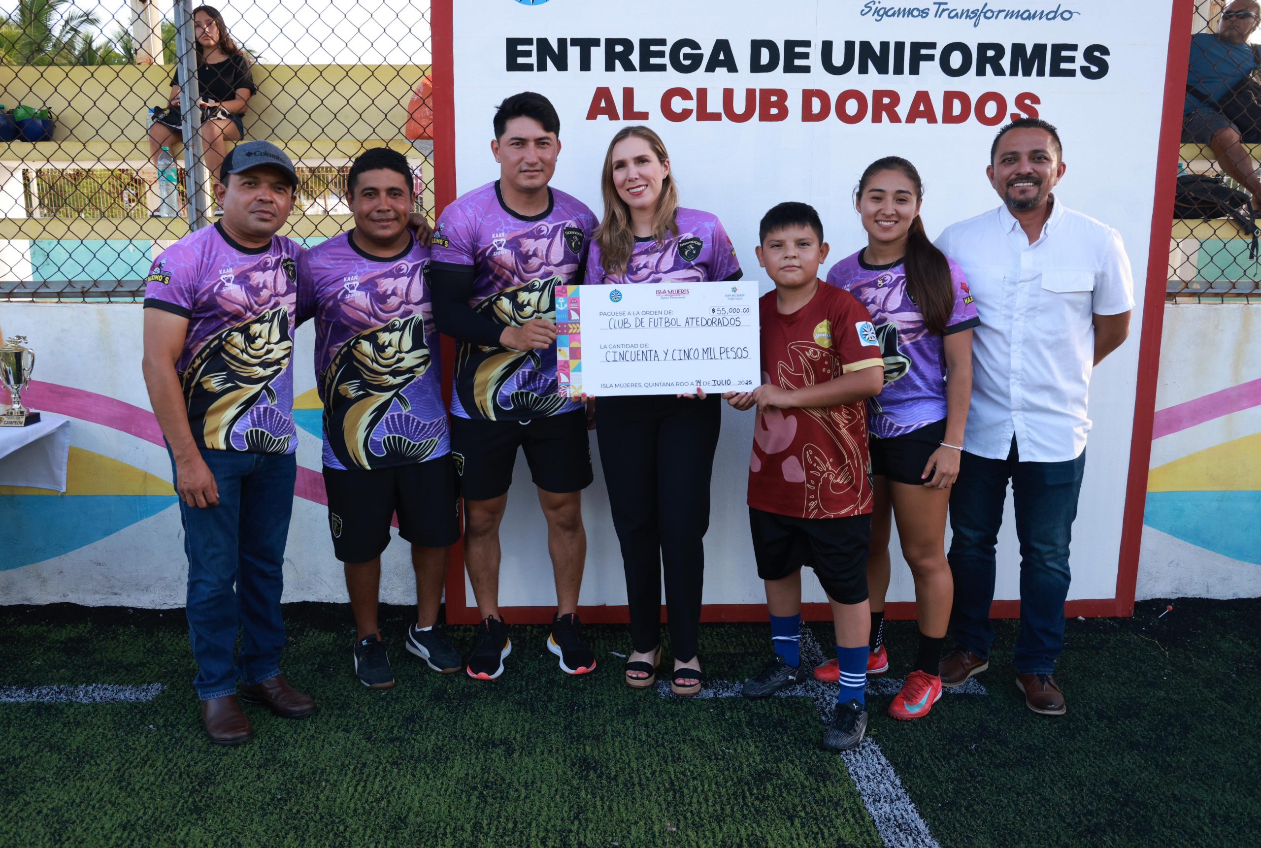 Isla Mujeres, Quintana Roo a 14 de julio de 2025.-Refrendando su apoyo decidido al deporte, la Presidenta Municipal, Atenea Gómez Ricalde, entregó 43 uniformes nuevos al Club Dorados F.C. Isla Mujeres, consistentes en playera y short.
