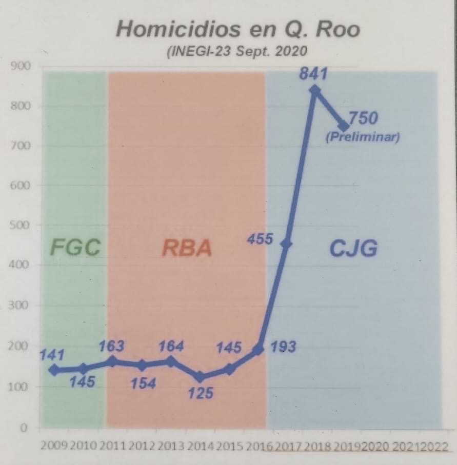 Las cifras respaldan parte de sus señalamientos: durante el sexenio de Carlos Joaquín, los homicidios se multiplicaron por seis, convirtiendo a destinos turísticos como Cancún, Playa del Carmen y Tulum en focos rojos de violencia.