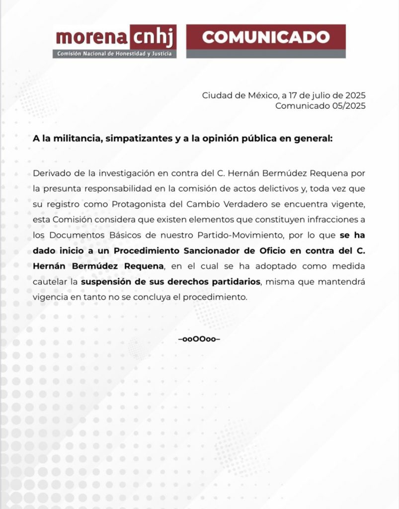 CIUDAD DE MÉXICO.— La Comisión Nacional de Honestidad y Justicia (CNHJ) del Movimiento de Regeneración Nacional (Morena) confirmó la suspensión de los derechos partidistas de Hernán Bermúdez Requena, extitular de Seguridad en Tabasco afiliado al instituto político desde el año 2023. El exfuncionario se encuentra prófugo y es señalado como líder del grupo de crimen organizado conocido como “La Barredora”.