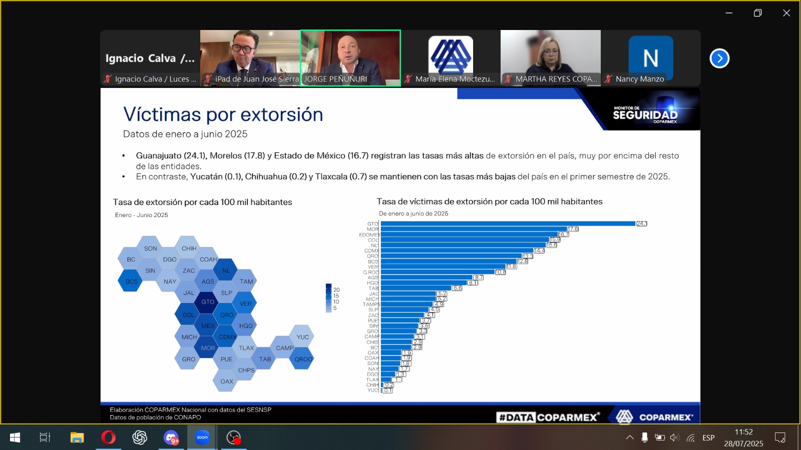 Juan José Sierra, presidente nacional de Coparmex, advirtió que se contabilizaron 34 mil 12 casos de robo a negocios en todo el país entre enero y junio, de los cuales cuatro de cada 10 fueron violentos, lo que representa un entorno de riesgo para empresarios y generadores de empleo.