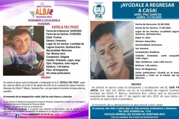 Este operativo se desarrolla en un contexto delicado: dos personas fueron reportadas como desaparecidas en Laguna Guerrero en agosto de 2025. Se trata de Saúl Paz García, visto por última vez el 17 de agosto, y Estela Tec Poot, reportada como desaparecida el 21 del mismo mes.