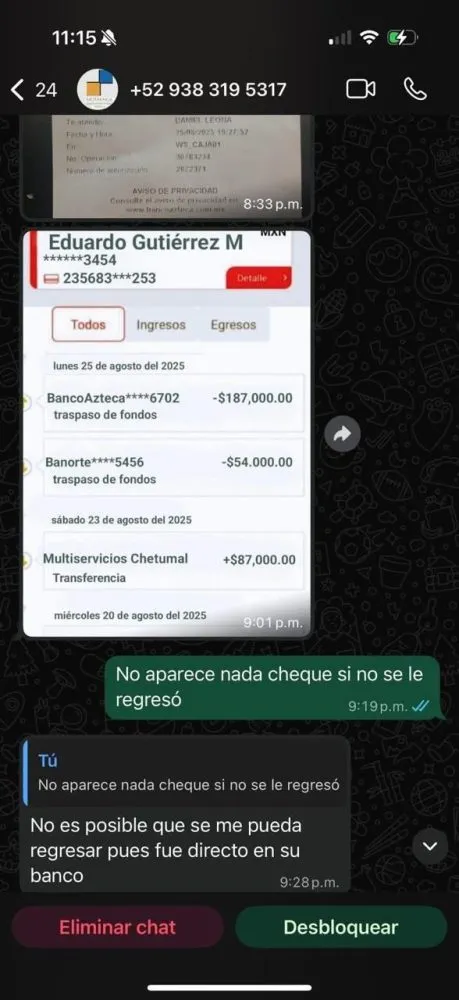 Gracias a su experiencia en el sector bancario, la denunciante detectó la irregularidad a tiempo y evitó el fraude. Sin embargo, tras confrontar al presunto estafador, recibió amenazas. El individuo operaba con un número telefónico con lada de Chetumal, presentó una credencial de elector de Campeche y envió a un supuesto trabajador, identificado como Edgar José Luis, para concretar la compra.