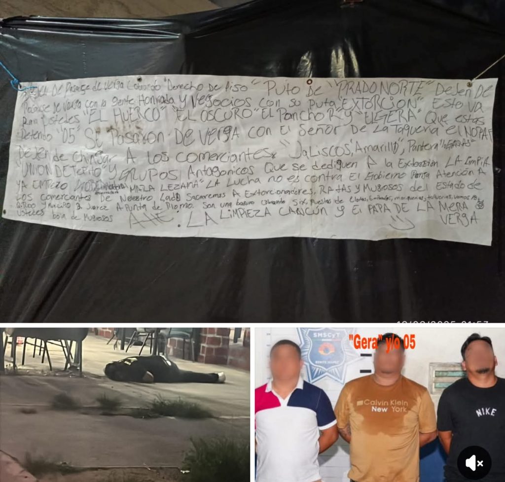 De acuerdo con información extraoficial, la madrugada del viernes fue colocada una narcomanta en la avenida Kabah con Portillo, en la cual se señalaban directamente a sujetos identificados con los alias de “Herco”, “Oscuro”, “Pancho R”, “Gera”, “Amarillo”, “Pantera” y/o “Garras” como los responsables del atentado armado.