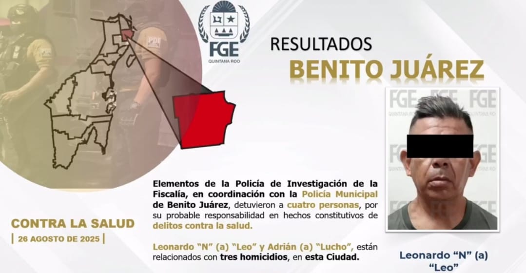 López Salazar detalló que Leonardo N es propietario de un local de artesanías en el Mercado 28, el cual era usado para la venta de drogas y junto con Adrián N, está relacionado con tres homicidios cometidos en Cancún.