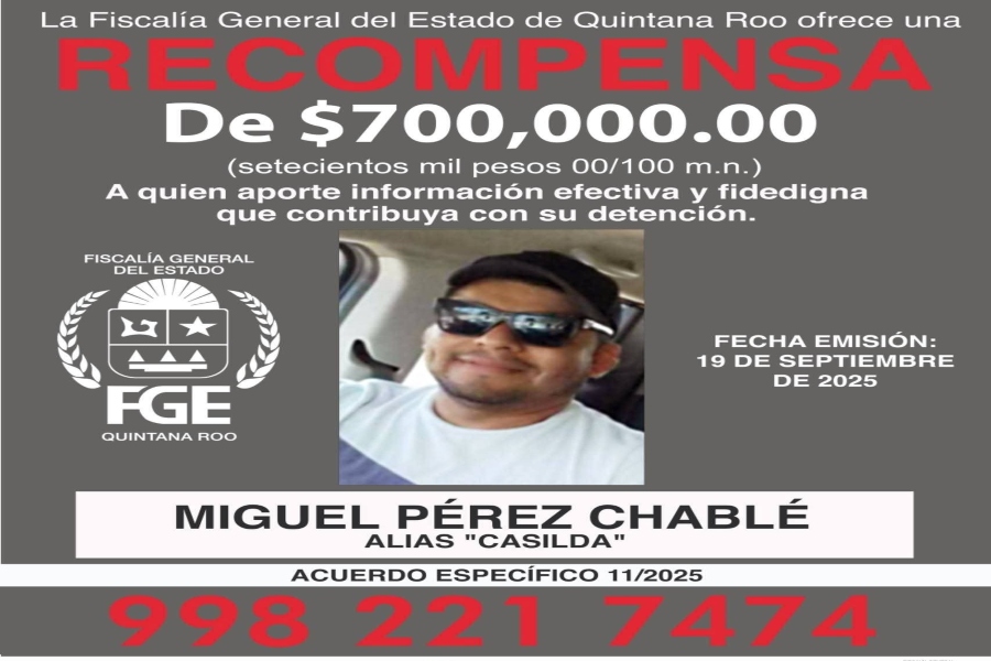 A través de sus redes sociales, la dependencia informó: “La #FGEQuintanaRoo ofrece #recompensa de setecientos mil pesos a quien aporte información efectiva y fidedigna que contribuya con la detención de la persona identificada como Miguel Pérez Chablé alias ‘Casilda’”.