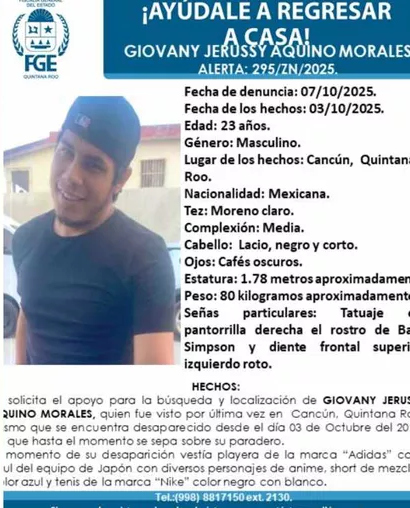 Cancún, Quintana Roo. — La Fiscalía General del Estado (FGE) de Quintana Roo activó este martes una ficha de búsqueda para localizar a Giovany Jerussy Aquino Morales, un joven de 23 años que se encuentra desaparecido desde el pasado viernes 3 de octubre.