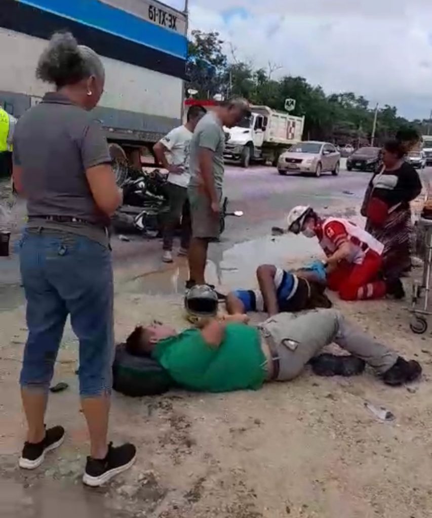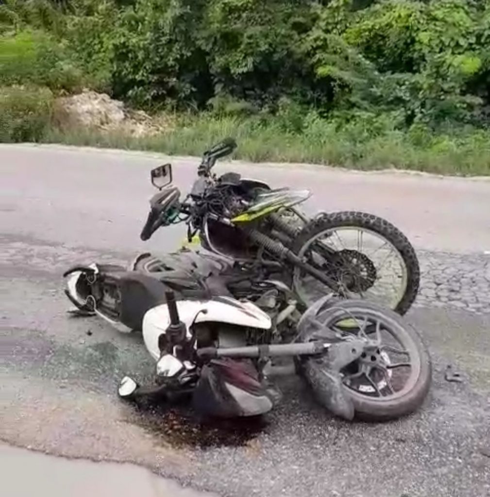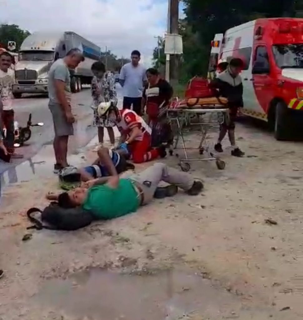 Cancún, Q. Roo.– La mañana de este jueves, dos motociclistas resultaron con diversas lesiones tras un choque frontal registrado sobre la carretera Gas Auto, a unos metros del cruce con el libramiento de la autopista Mérida-Cancún.