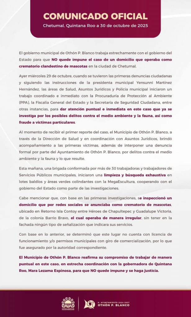 De acuerdo con las primeras investigaciones, el establecimiento operaba de manera irregular y sin contar con los permisos municipales necesarios. El Ayuntamiento de Othón P. Blanco confirmó que el negocio no tenía licencia de funcionamiento ni autorización para ofrecer servicios de cremación, por lo que fue asegurado por las autoridades.