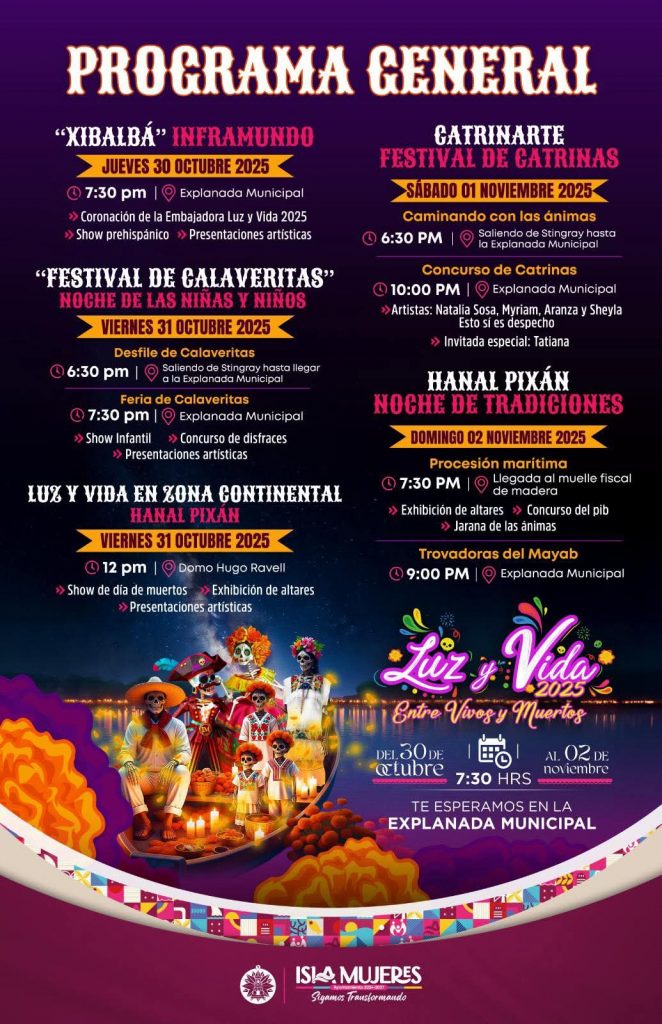 Isla Mujeres se engalana para recibir a residentes y visitantes en una serie de eventos culturales y tradicionales con motivo del Día de Muertos, en el marco de su festival «Luz y Vida 2025». Del 30 de octubre al 02 de noviembre, la Explanada Municipal y otros puntos clave de la isla serán el escenario de celebraciones que honran la memoria de los difuntos con alegría, color y misticismo.