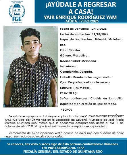 JOSÉ MARÍA MORELOS.- Autoridades confirmaron la localización con vida de Yahir Enrique Rodríguez Yam, joven de 24 años que había sido reportado como desaparecido desde el pasado sábado en la alcaldía de Dziuché.