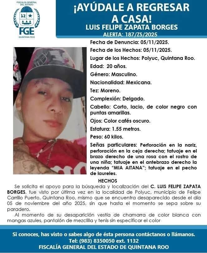Un joven de 20 años, identificado como Luis Felipe Zapata Borges, fue privado de su libertad la tarde del miércoles en el Libramiento de Polyuc, comunidad maya perteneciente al municipio de Felipe Carrillo Puerto.