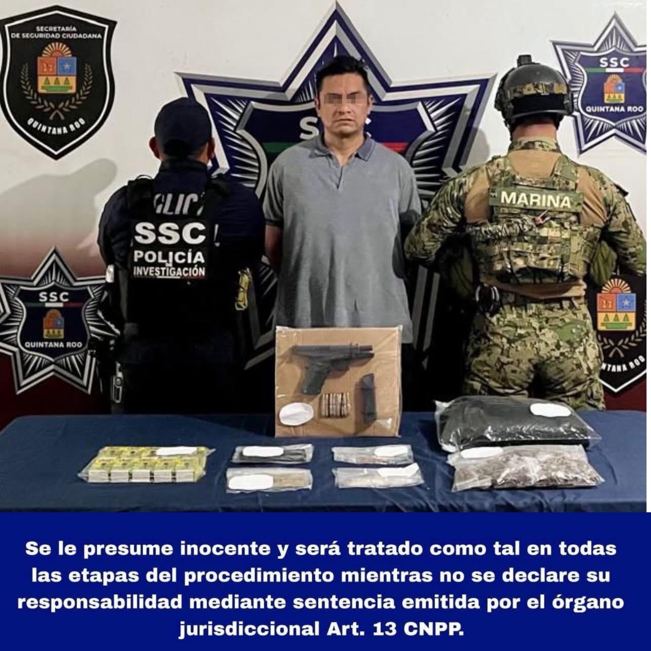 Cancún, Quintana Roo.— Elementos del Grupo de Investigación de la Secretaría de Seguridad Ciudadana, en coordinación con la Secretaría de Marina, detuvieron a Rogelio “N”, presunto implicado en delitos contra la salud y violación a la Ley Federal de Armas de Fuego y Explosivos.