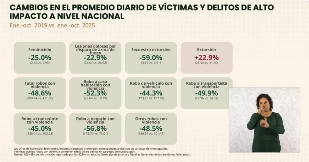 Durante la Mañanera del Pueblo, Marcela Figueroa, titular del Secretariado Ejecutivo del Sistema Nacional de Seguridad Pública, informó que entre enero y octubre de 2024, comparado con el mismo periodo de 2025, 26 entidades redujeron su promedio diario de homicidios dolosos.