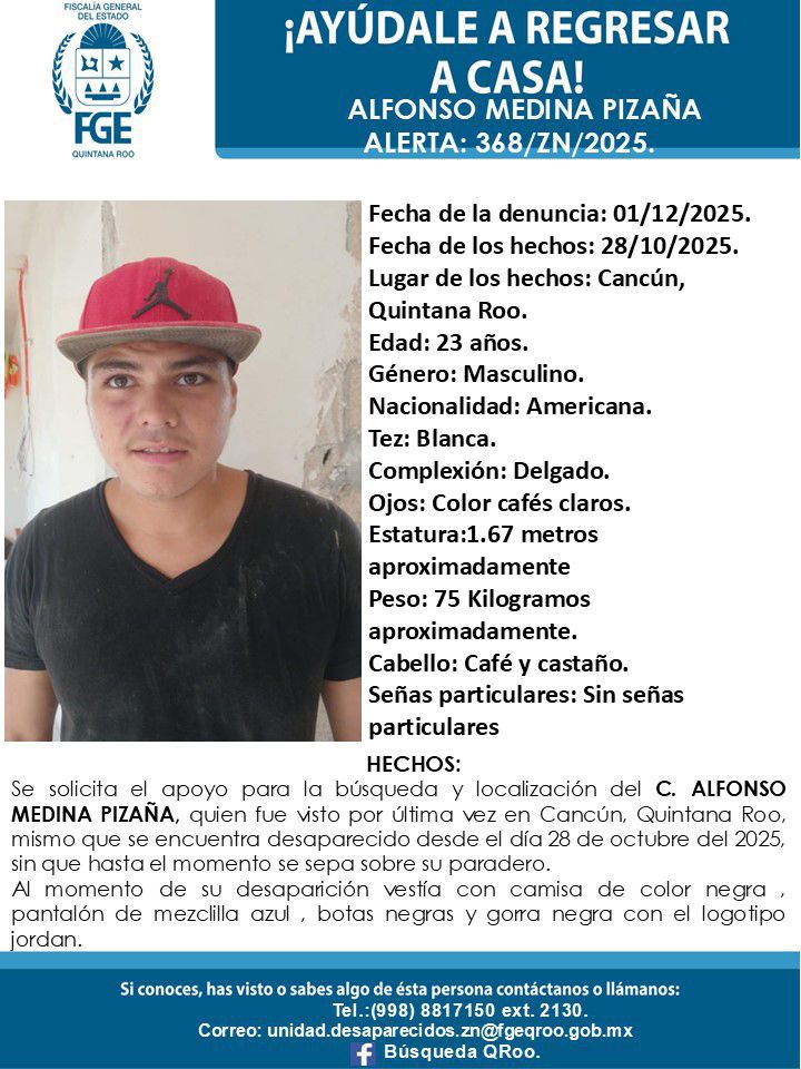 CANCÚN.- Una madre solicita el apoyo de la ciudadanía para localizar a su hijo Alfonso Medina Pizaña, de 23 años, desaparecido desde el pasado 23 de octubre en la ciudad de Cancún.