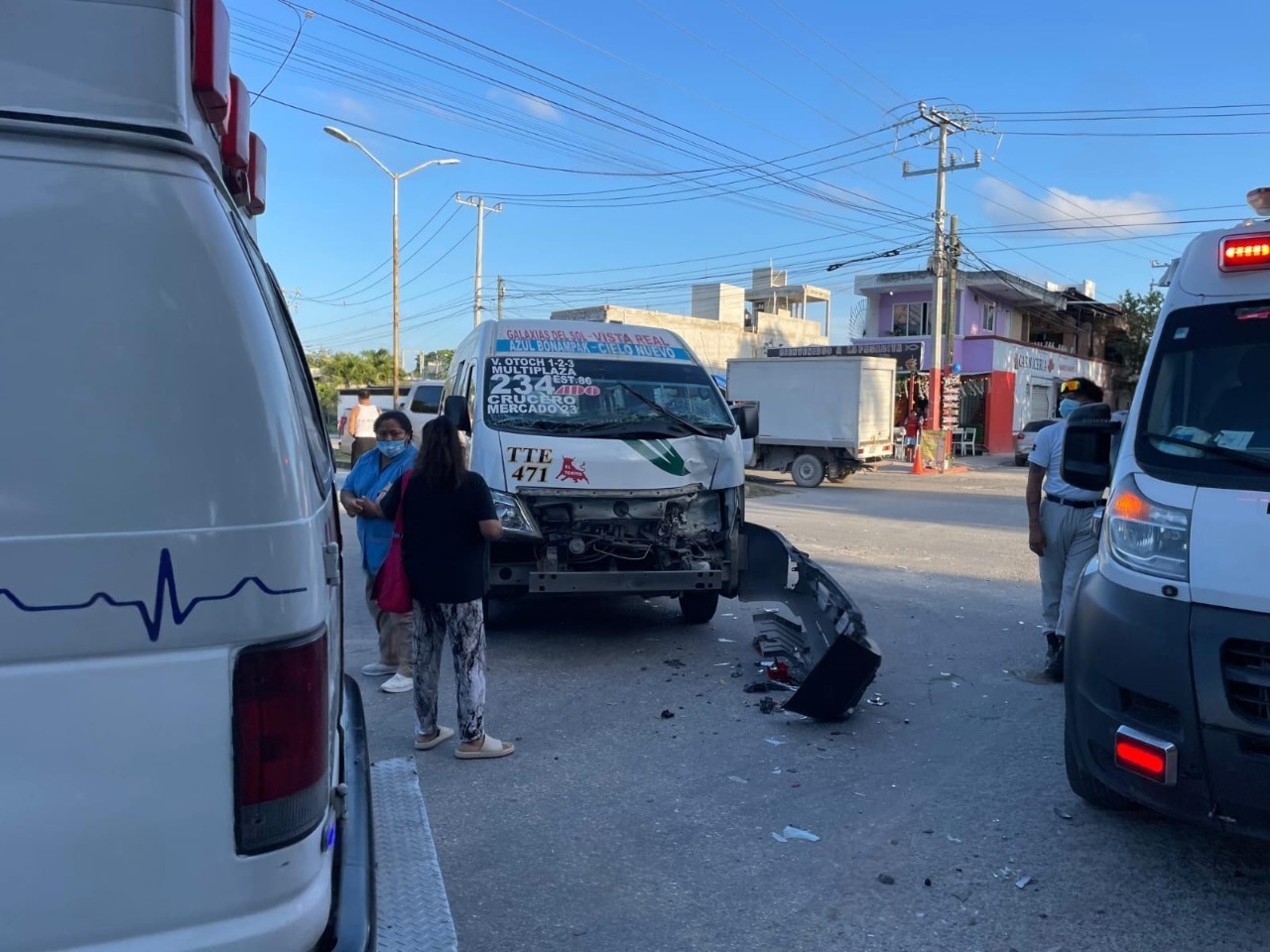 De acuerdo con los primeros reportes, la unidad de la concesionaria TTE, con número económico 471, circulaba sobre la avenida Los Tules cuando, al llegar a la calle Chemuyil, se impactó con otro vehículo, provocando que varios pasajeros resultaran heridos al interior de la combi.