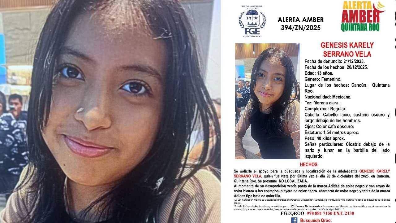 Cancún, QR.-La Fiscalía General de Justicia del Estado de Quintana Roo activó una ficha de búsqueda para localizar a Génesis Karely Serrano Vela, una adolescente de 13 años reportada como desaparecida desde el pasado 20 de diciembre de 2025 en el municipio de Benito Juárez, en Cancún.