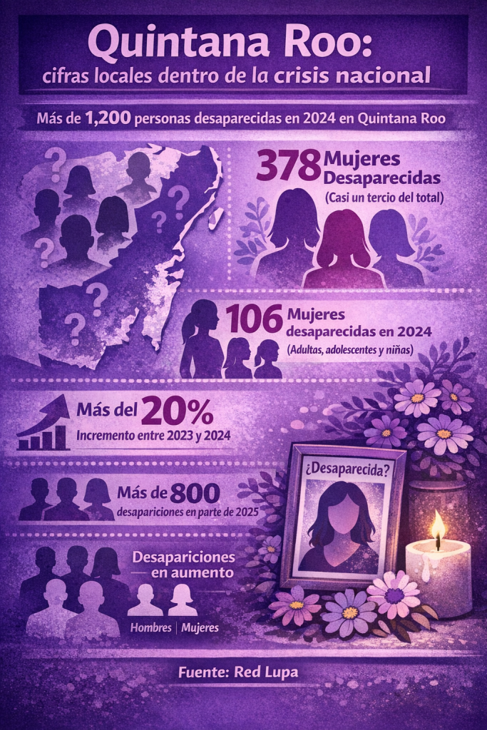 Con cortes recientes del RNPDNO y análisis de organizaciones civiles, en Quintana Roo se contabilizan más de mil personas desaparecidas, de las cuales cerca de un tercio son mujeres. Tan solo en 2024 se reportaron más de cien mujeres desaparecidas en la entidad, entre adultas, adolescentes y niñas, varias de ellas aún sin ser localizadas.
