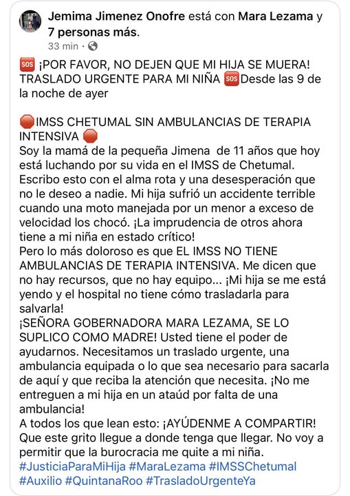 Chetumal, Q. Roo.– Una madre de familia hizo un llamado público y desesperado a las autoridades estatales para solicitar el traslado urgente de su hija de 11 años, quien se encuentra en estado crítico en el Hospital General del IMSS en Chetumal, tras haber sufrido un accidente vial.