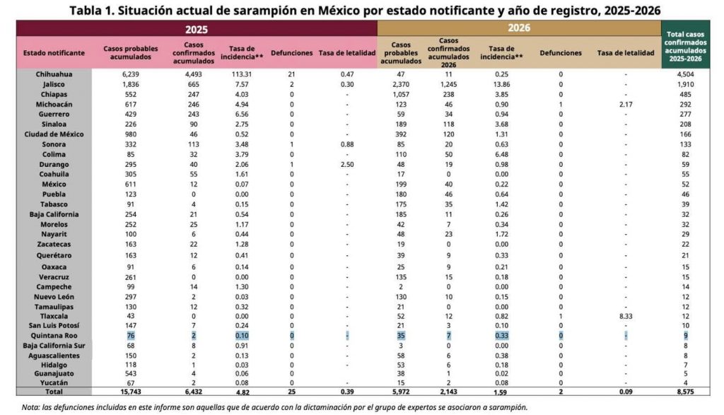 Las autoridades estatales, representadas por los SESA, mantienen vigilancia epidemiológica activa. Según el reporte federal, en lo que va de 2026 la Península de Yucatán registra cuatro casos: dos en la entidad y dos en Yucatán, mientras que Campeche no presenta contagios confirmados hasta el momento.
