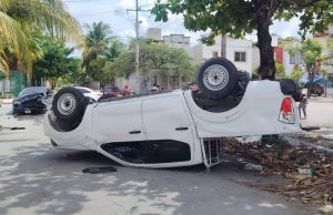 CANCÚN.— Un automóvil volcado fue el resultado de un accidente de tránsito en el...
