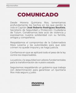 Redacción/Quintana Roo Ahora TULUM.- Morena Quintana Roo condenó el asesinato del secretario de Seguridad...